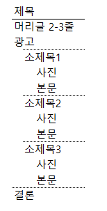 글의 주제가 정해졌다면 소제목 2-3개를 먼저 나열하고 글을 쓰기 시작해야 합니다. 위 사진은 저의 글쓰기 방식이긴 한데 소제목을 먼저 글에 박아두고 작성합니다. 사실상 큰 범위를 지정하면 소제목에 맞게 글을 쓰면 미시(Mece) 관점에서도 중복이 없게 글 작성이 가능하며 시간 효율적으로 글을 작성할 수 있게 됩니다. 미시라는 것은 중복되지 않으면서도 누락이 없는 방법을 말합니다.