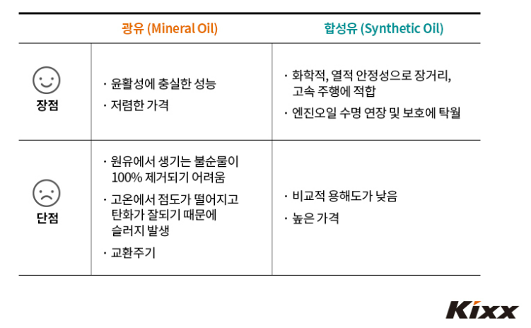 일반적으로 광유와 합성유로 나뉘게 되며 각각의 장단점은 위 그림과 같습니다. 광유의 경우 순수원유 정제시에 만들어 지기 때문에 비교적 저렴한 가격이지만 '황' 이 조금은 남아있어 교환시기가 짧습니다. 합성유의 경우는 가격이 비싸지만 광유에 비해 엔진수명이나 점도 등 유리한 편입니다. 만약 시내주행이 많거나 운행이 많지않으면 광유가 좀 더 적합하며 그 반대로 고속도로나 주행이 많으면 합성유가 좀 더 어울립니다.