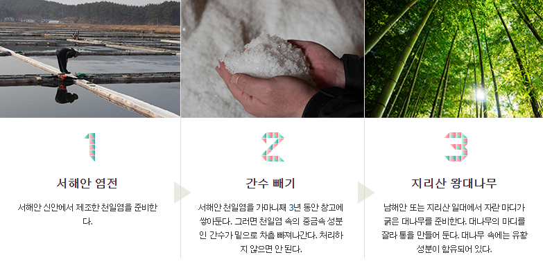 죽염의 제조법이 일반인에게 공개된 것은 1971년 대한화보를 통해서 공개되기 시작하였습니다. 죽염은 대나무통에 소금을 넣고 황토로 입구를 봉한 후, 쇠가마(전통제조법은 황토가마)에 넣고 소나무 장작을 사용하여 구워냅니다. 구울 때 대나무진이 천일염에 녹아서 소금덩어리가 되는데, 덩어리를 다시 빻아서 대나무에 넣고 굽는 과정을 8번 반복하게 됩니다. 마지막 9번째에는 송진을 사용해 1200도 이상으로 가열하여 완성시킵니다.
