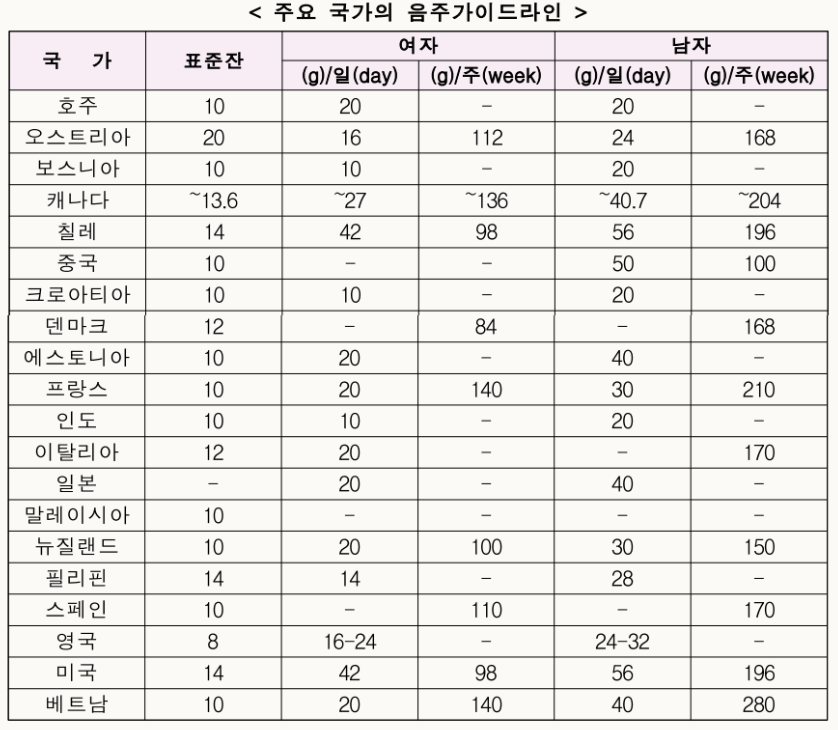 WHO와 주요 선진국에서는 음주의 위험발생 정도에 따라 적정 음주 가이드라인을 가지고 있습니다. 그러나 피부가 빨갛게 되는 알코올분해효소가 적은 동양인의 경우는 사실 이보다 더 적은 음주 허용치만이 있다고 보아야 합니다. 위에서 계산한 (g) 기준으로 해석하시면 대충 어느정도 되실지 가늠하기 쉬우실 듯 합니다.