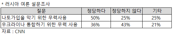 다만 미국에서는 그래도 우리가 지켜보고 있다는 의미로 독일에 7천명 추가 파명을 결정하였고 부다페스트 양해각서에 의해 미국은 각 종 무기를 지원하고 있습니다. 추가적으로 미국내에서도 AP통신자료에 따르면 미국의 개입을 소극적 역활이여야 한다가 52%, 적극적 역활이여야 한다가 26%정도였습니다.