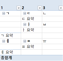 똑같이 ALT + D + P 연타후 클래식 피벗 만들기로 설정합니다. 그 후 맨 왼쪽 세로로 되어있는 칸에 ( 행 필드를 여기로 끌어옵니다 부분) 노란색 셀에 해당하는 값을 드래그로 가져오게 되면 아래와 같이 정렬됩니다.